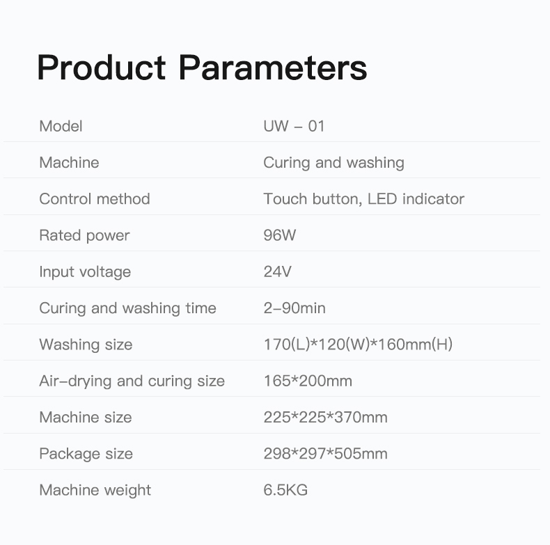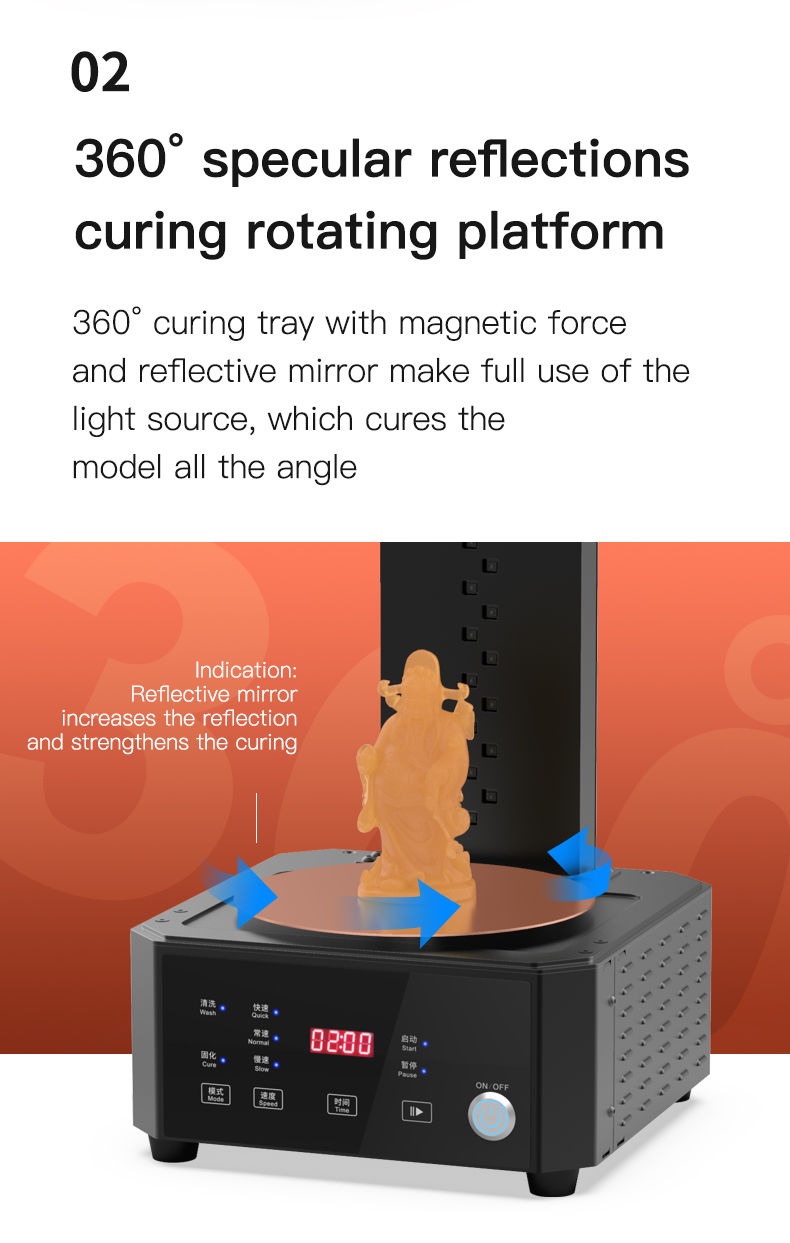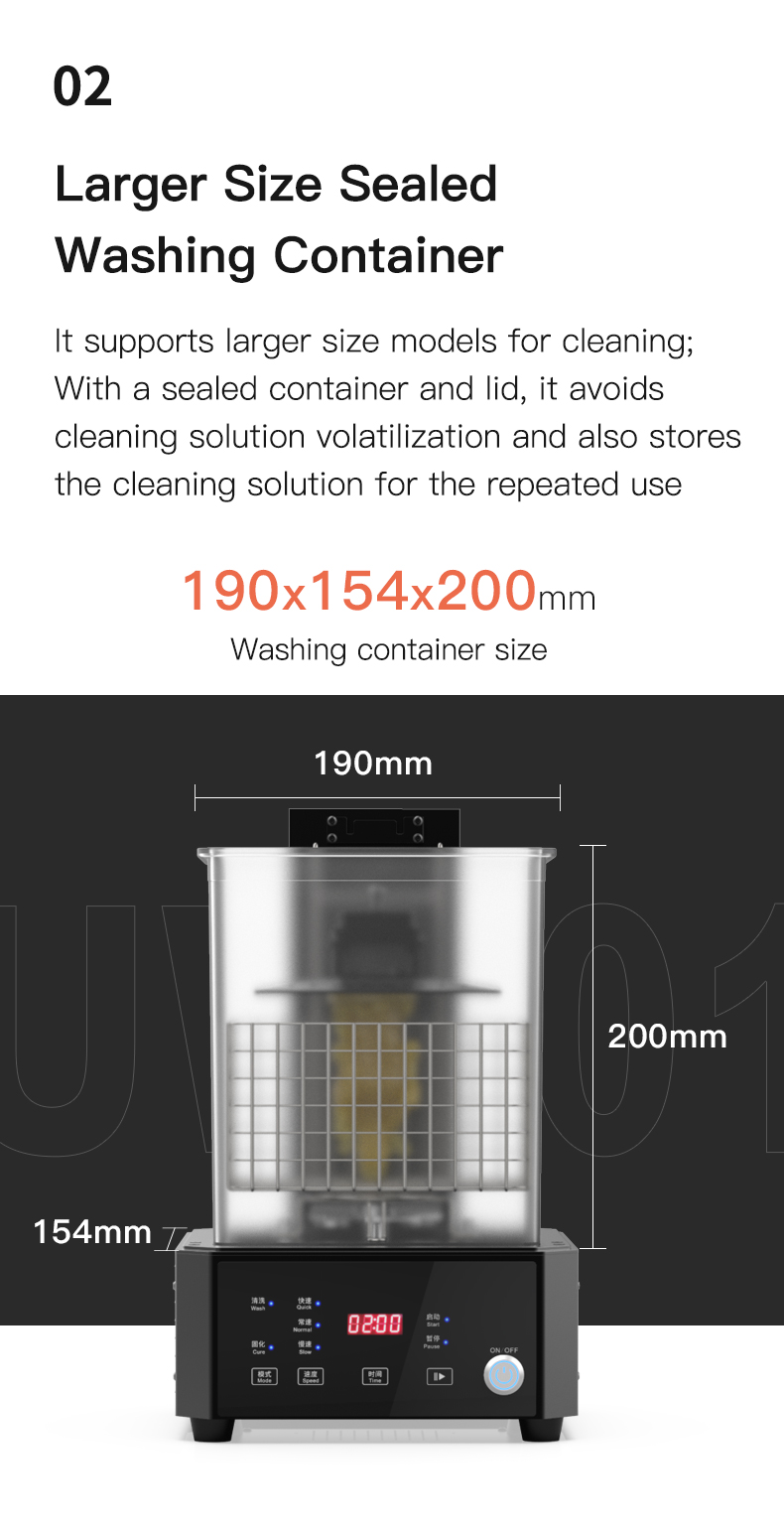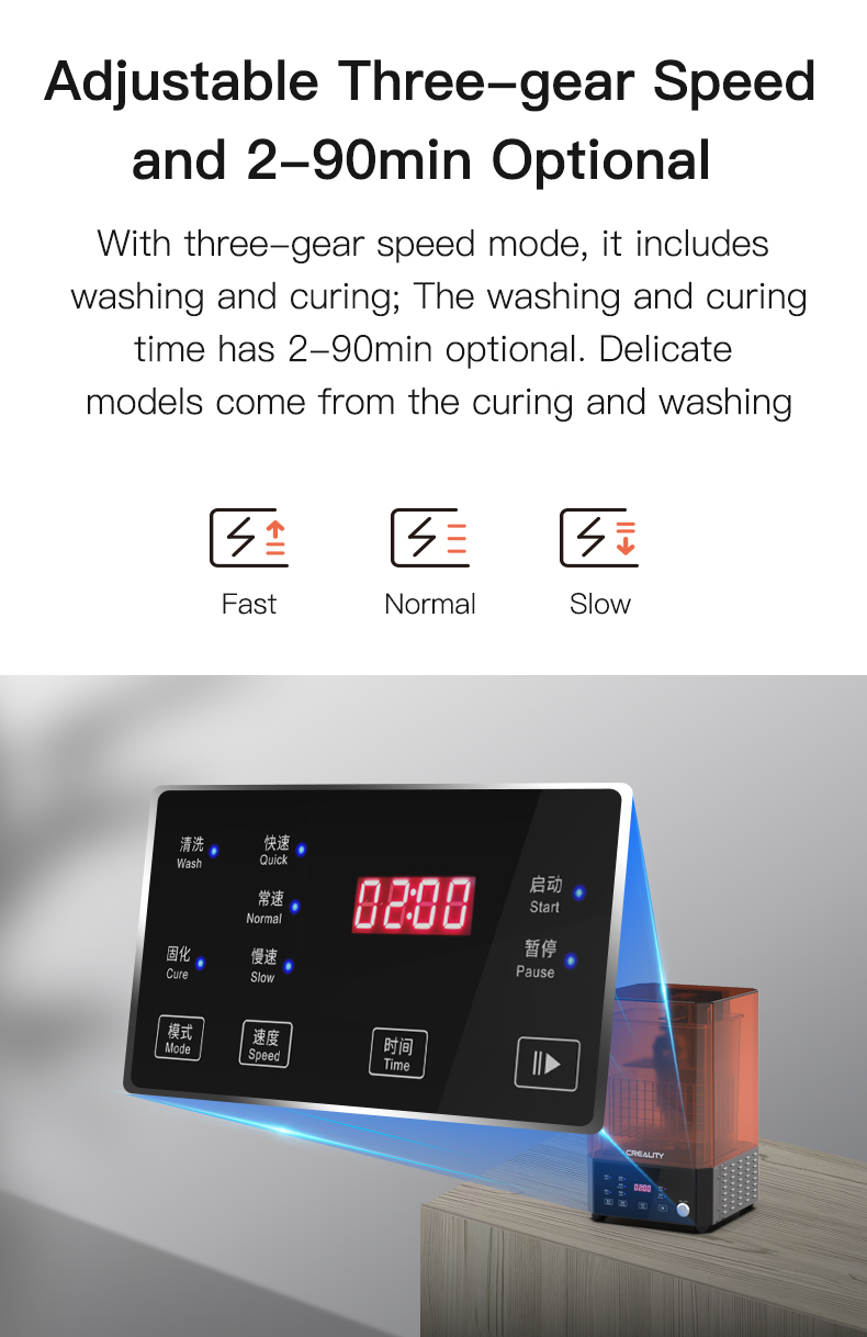Le bouton tactile permet un fonctionnement très simple. Vous pouvez facilement passer du mode "Wash" au mode "Cure". En option, vous pouvez également régler le temps et la vitesse - la durée et la vitesse à laquelle la machine devra nettoyer ou durcir l'objet 3D.
