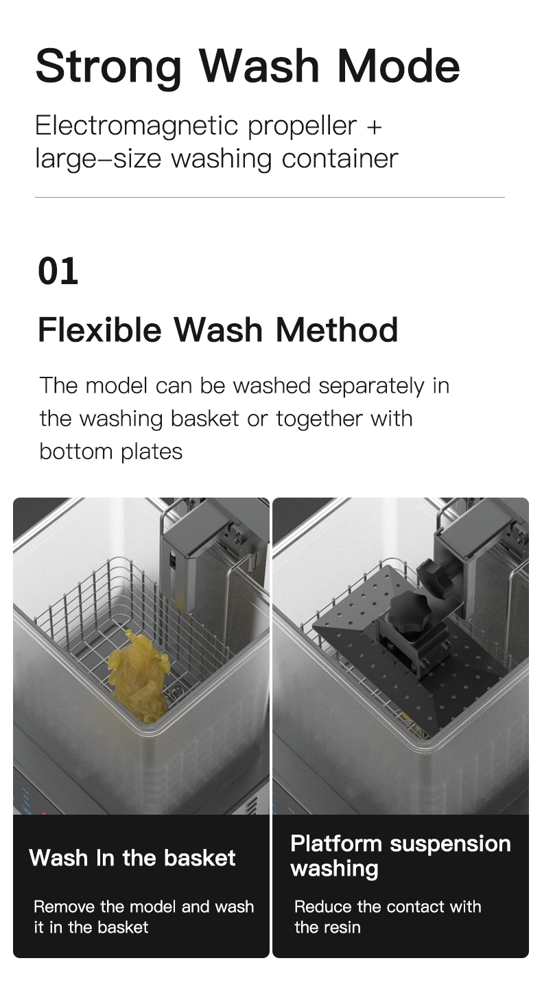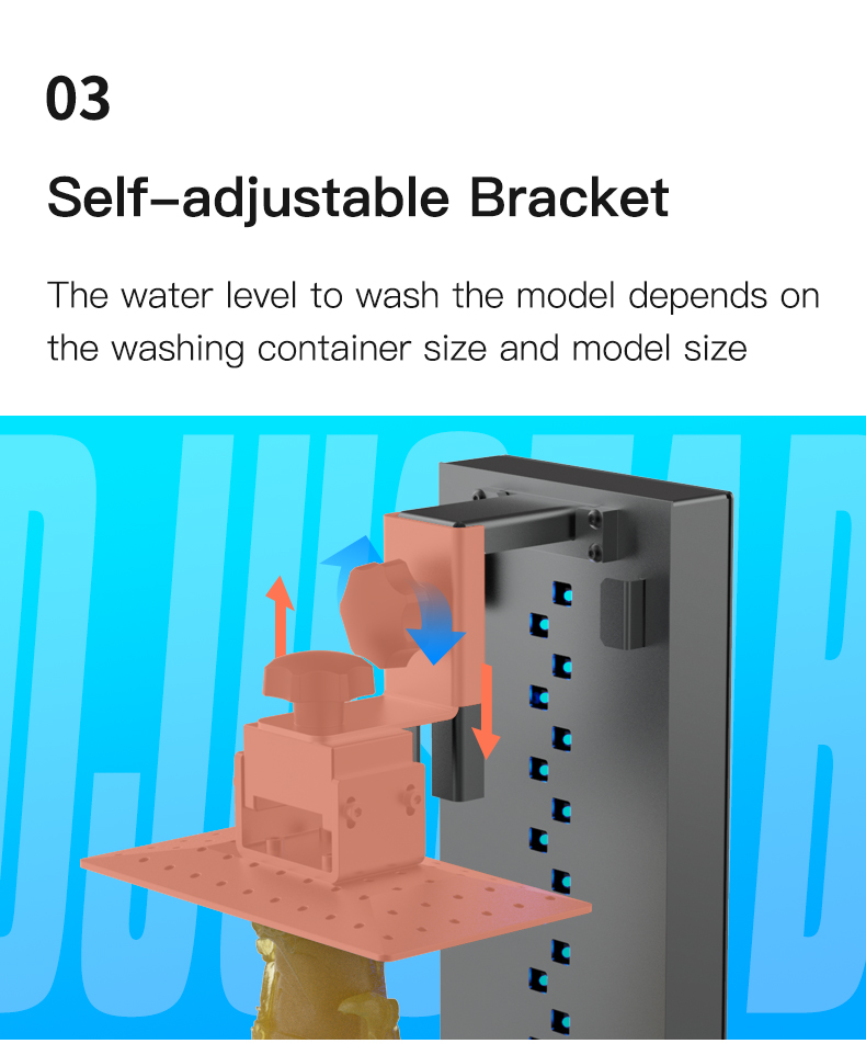Pour les clients qui possèdent une imprimante LD-002R/LD-002H, une autre fonctionnalité est disponible ! Vous pouvez directement retirer la plate-forme de votre LD-002R/LD-002H et la placer sur la machine Wash & Cure, évitant ainsi tout contact avec la résine non polymérisée. En outre, la hauteur du support est réglable, de sorte qu'il n'est pas nécessaire de remplir complètement le réservoir.