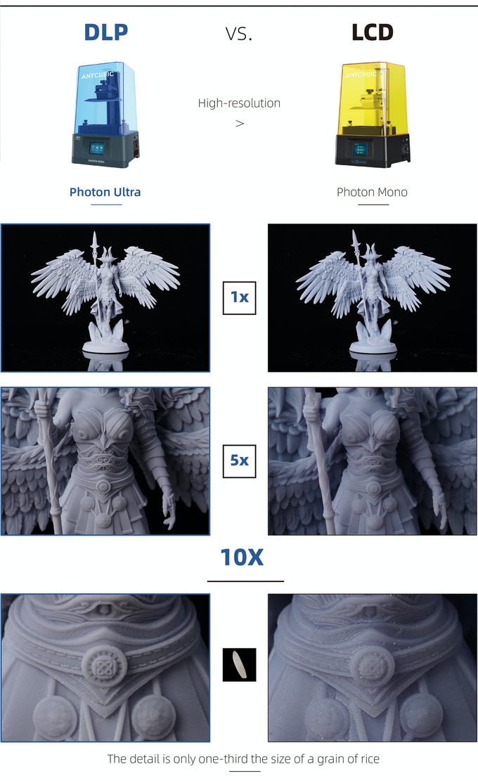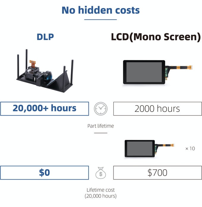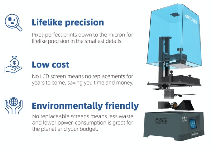 La nouvelle Photon Ultra est une imprimante 3D avec un projecteur DLP grand public révolutionnaire. L'avantage de cette technologie est la précision encore plus élevée que nous pouvons atteindre par rapport aux écrans monos. De plus les projecteurs DLP ont une durée de vie 10x plus élevée qu'un écran classique.
