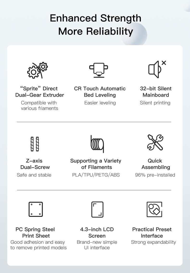 L'Ender 3 S1 est une nouvelle version améliorée de la très populaire Ender 3. Équipée, entre autres, d'une nouvelle extrudeuse directe à double engrenage, d'un nivellement automatique du lit et d'une carte mère silencieuse de 32 bits, la S1 est une imprimante très abordable qui offre tout ce que vous pouvez souhaiter à ce niveau de prix.